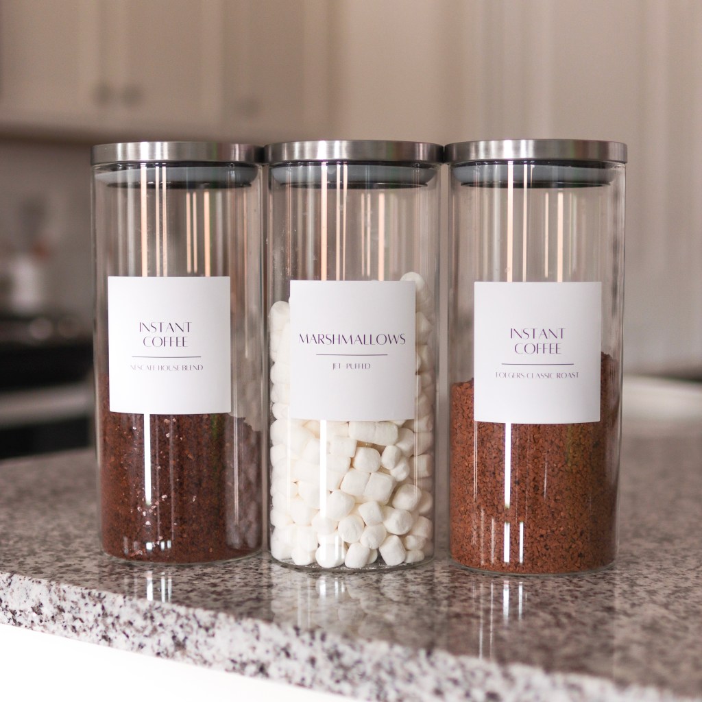 I have a newfound love for organizing, and labeling plays a huge role in that. There are tons of options to purchase labels for your home on Etsy, Amazon, The Container Store and more! I’ve purchased labels from Amazon for my bathroom and coffee station and while they were amazing, I found I needed a little bit more customization. When I need two of the same labels or need “instant coffee” versus “coffee” then customizing is probably the best option!