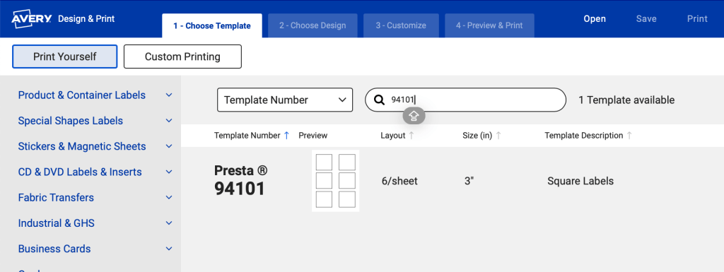 1. Once your account is created, you will search the template number that is listed on the outside of the label packaging.