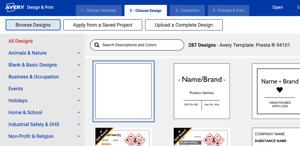 2. Avery offers templates designs to choose from which is a quick and easy option. For even more customization, I like using Canva to make a design and then upload it to the Avery site. For this option, you would select a blank label in Avery.