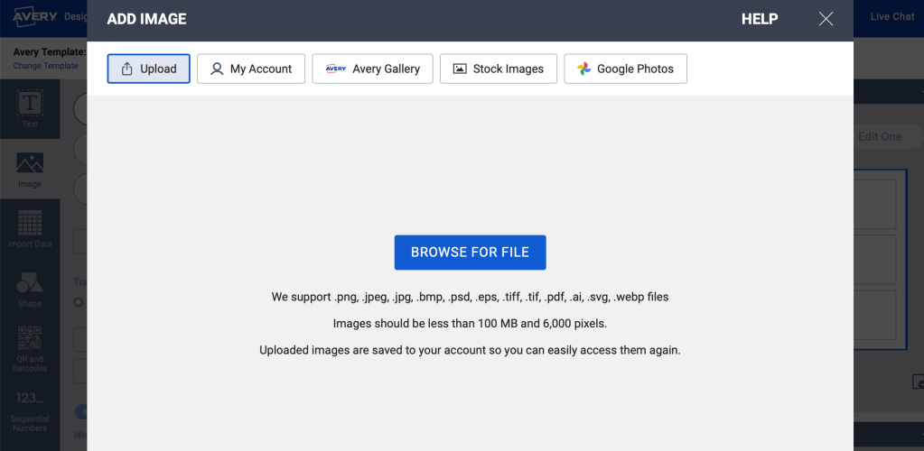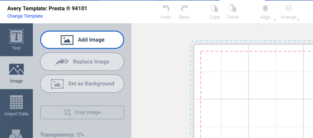 4. You will “Add Image” in Avery where you can upload your downloaded Canva design. Note: You will have to add each design individually to each label page.